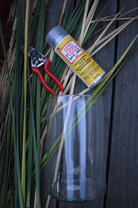 Cut and arrange cattails and plantings in large glass container. I like to stagger the heights of different elements in the container for a multi dimensional effect.